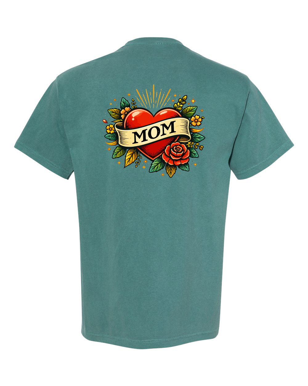 Channeling the timeless, rebellious spirit of old-school flash art, this tee features the iconic vintage "Mom" tattoo design—complete with bold lines, a classic heart, and a ribbon banner. It’s the perfect blend of edgy style and undeniable appreciation for the toughest, most loving person you know.